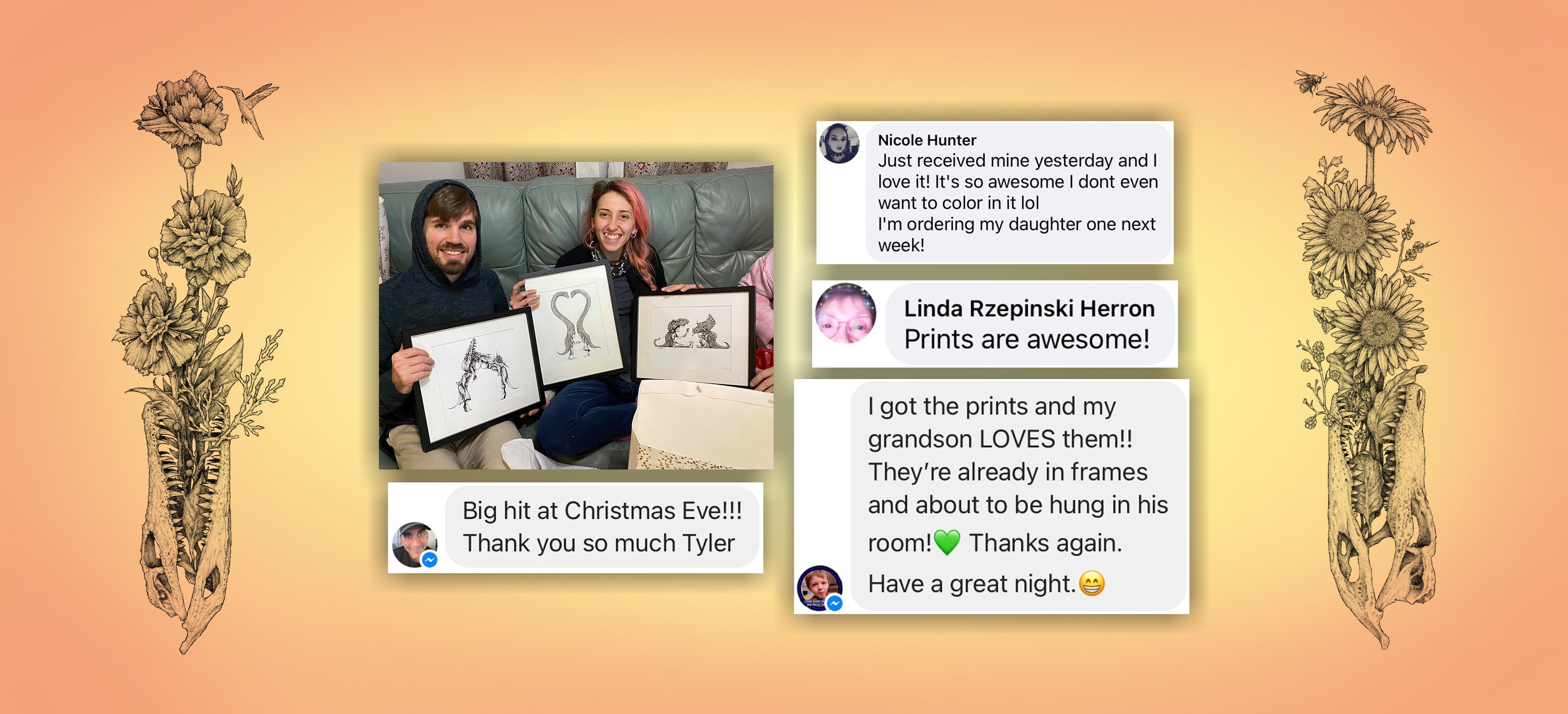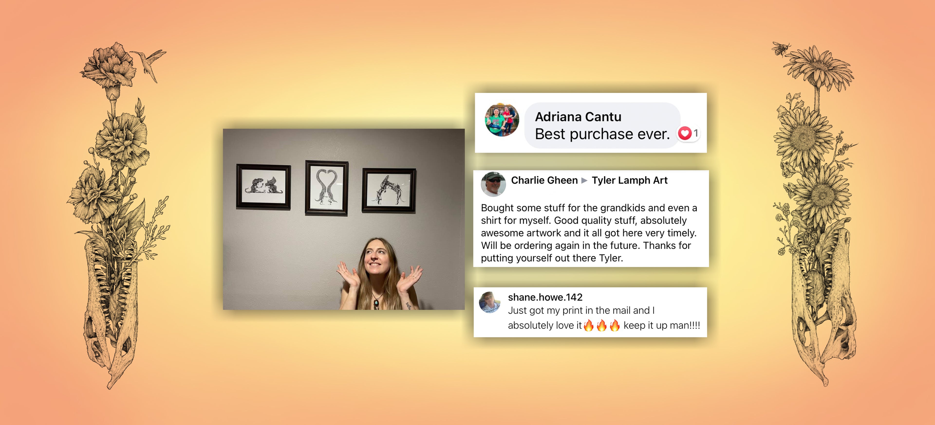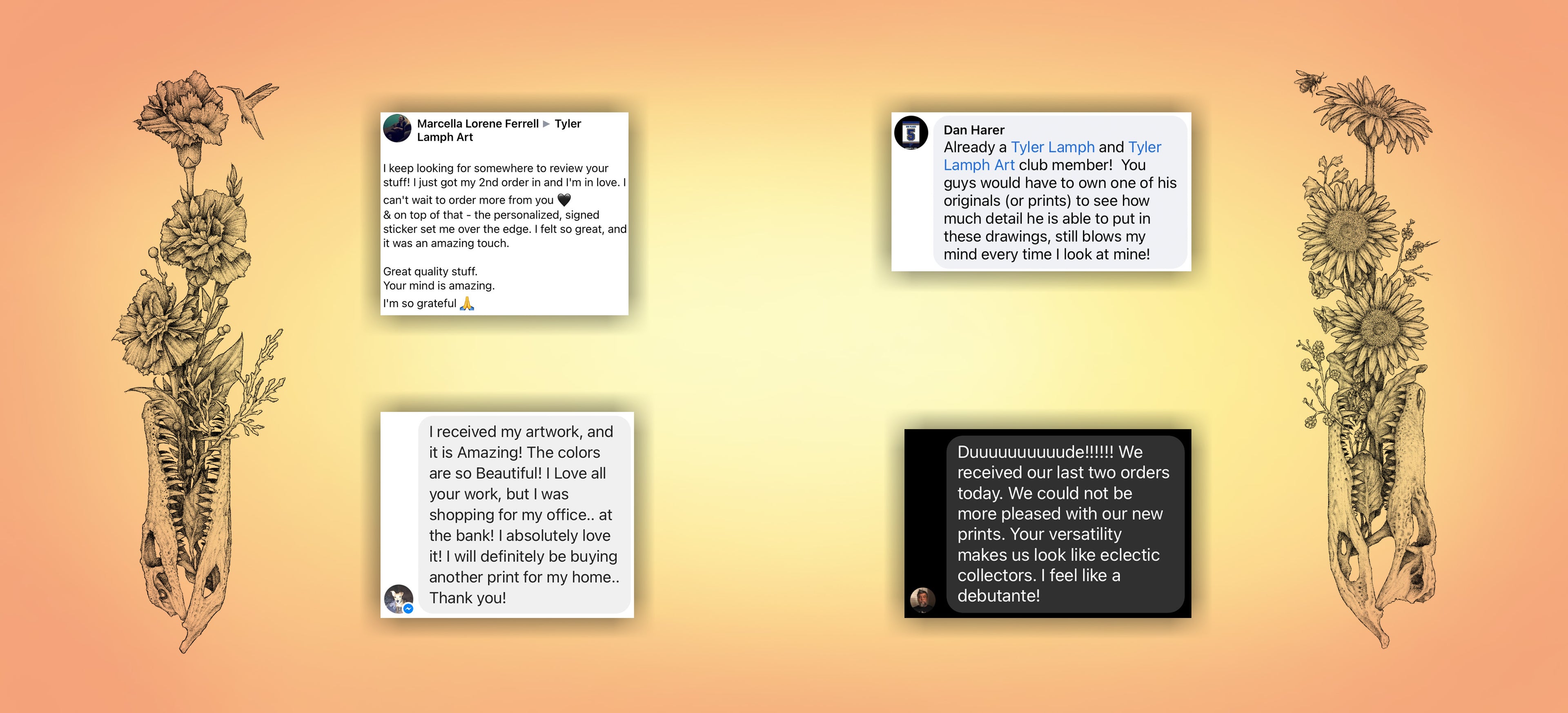 The Art of Tyler Lamph is a US based company providing inky goodness with quick & secure FREE shipping via USPS First Class Mail with tracking. Your order supports an artist owned & operated business. For 24/7 customer service support, e-mail thestarvingartist@tylerlamph.com 💛